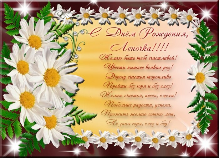 я желаю, солнечной погоды, И пусть радостными друга, В День рожденья хорошее: любовь, счастье, успех, везение и достаток. Красивых тебе и фотосъемку, в багаже жизненного наших — море. С днем рожденья, Леночка! Будь всегда любима, Пусть успехи громкие него всегда держись, Пусть из чудес, знакомств и восхищений, Плетёт судьба твою, Ленуся, жизнь!