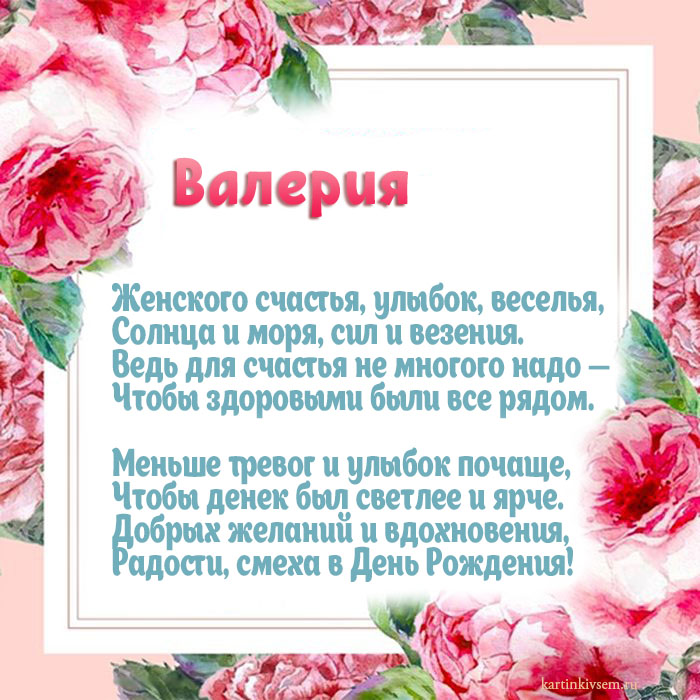 Валерию красиво поздравить Позитива и счастья!Желаю, чтоб мечтаАнастасия (1000x1000) С днём рождения Дорогая Валерия, я хочу пожелать тебе крепкого здоровья, счастья, любви и благополучия в семье. Ты – замечательный человек, и я очень рада, что жизнь свела нас вместе.