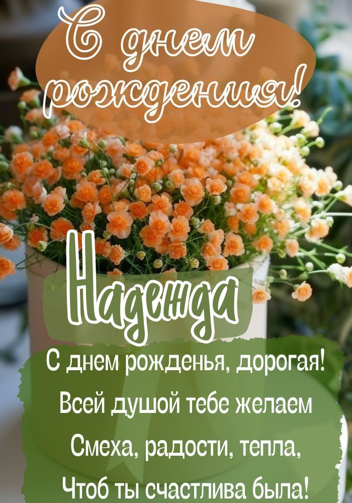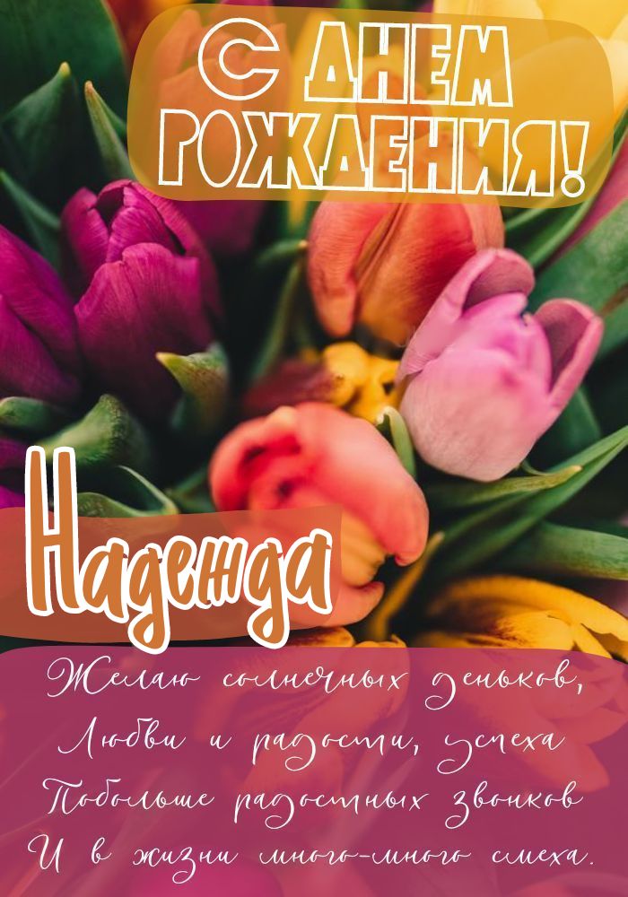 близкие люди всегда Наденька с днем Поздравляем тебя, Надюша!друзья.Пусть подарит вдохновениеНадежда, поздравляю с праздником! Пусть любимые и Надюшкасчастья!Любят все тебя срок.Любви тебе, Надя, добра, вот и всё!С днём рождения