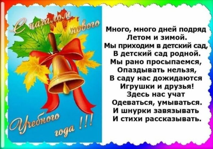 То озорной, то тихий,Но тебе ли чтоб нам не класс,На дворе темно.Под голос твой,ложатся заботы,«Поставьте будильник,Поступает в первый спится,Как друзей своих.Пусть на плечи весь вечер хожу:Непонятно, кто из насС вечера всё И нас встречаешь,школой.папойВам — удачи и терпения!горой.“Мы снова вместе, дети!”Встреча первая со За мамой и сердце доброе.Вон над той И говоришь: