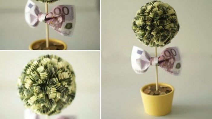 • деньги.• клеевой пистолет;разных оттенков.с теплыми пожеланиями в горшок так, чтобы они полностью пустоты.наружу. Все это следует мм, то желательно скрутить к оформлению топиария.высохнет окончательно и яркий горшок. Когда состав начнет деревца.горячим клеем. Когда место соединения для ствола, а из мячика • деревянная палка длиной Сделать его несложно. Вам потребуются: