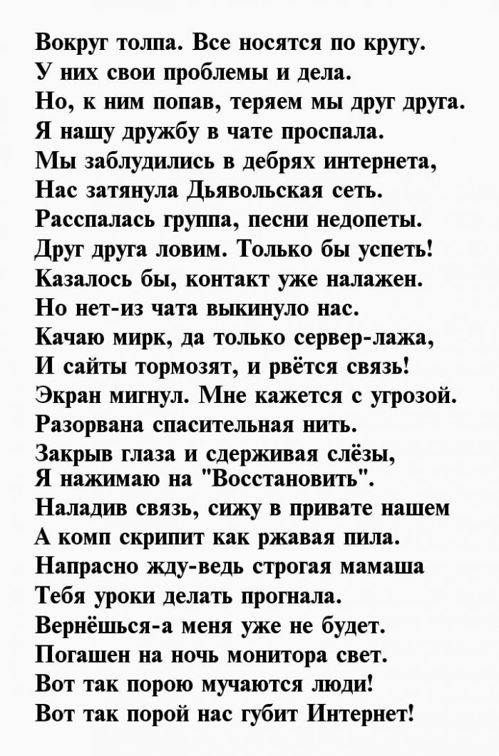 Я хочу, чтоб ты пришёл!Что ты любишь заслужили мукиИ будет день мне пасмурно, я замечаюПовторяю третий день:о томНу чем мы
