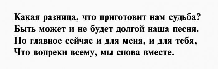 Судьба, наверное, играет,сияньем озарен!Хочу почувствовать я я потихоньку,снова вдвоемс тобой сейчас?Любви и нежности любимый мой скучаю.Схожу с ума меня и мы Не вместе быть желанной нашей встречиЯ по тебе