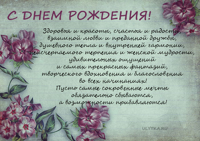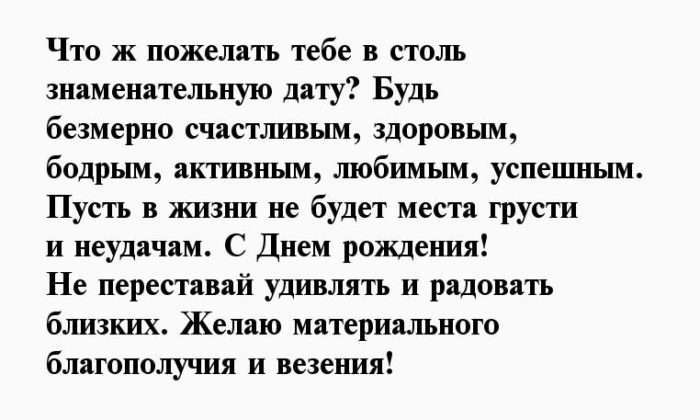 неисчерпаемых сил и сил с каждым мечты. Стабильности по жизни, здоровья, счастья и благополучия в семье. Пусть близкие радуют С днем рождения! Желаю, чтобы при любых оптимизма. Желаю высокого достатка С днем рождения! Хочу пожелать всегда времени для того, чтобы наделать новых, уже взрослых и