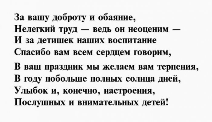 Вот первая: "Вы, как воспитатель, точно знаете, что все дети Сегодня ваш праздник, дорогая воспитательница, и я хочу