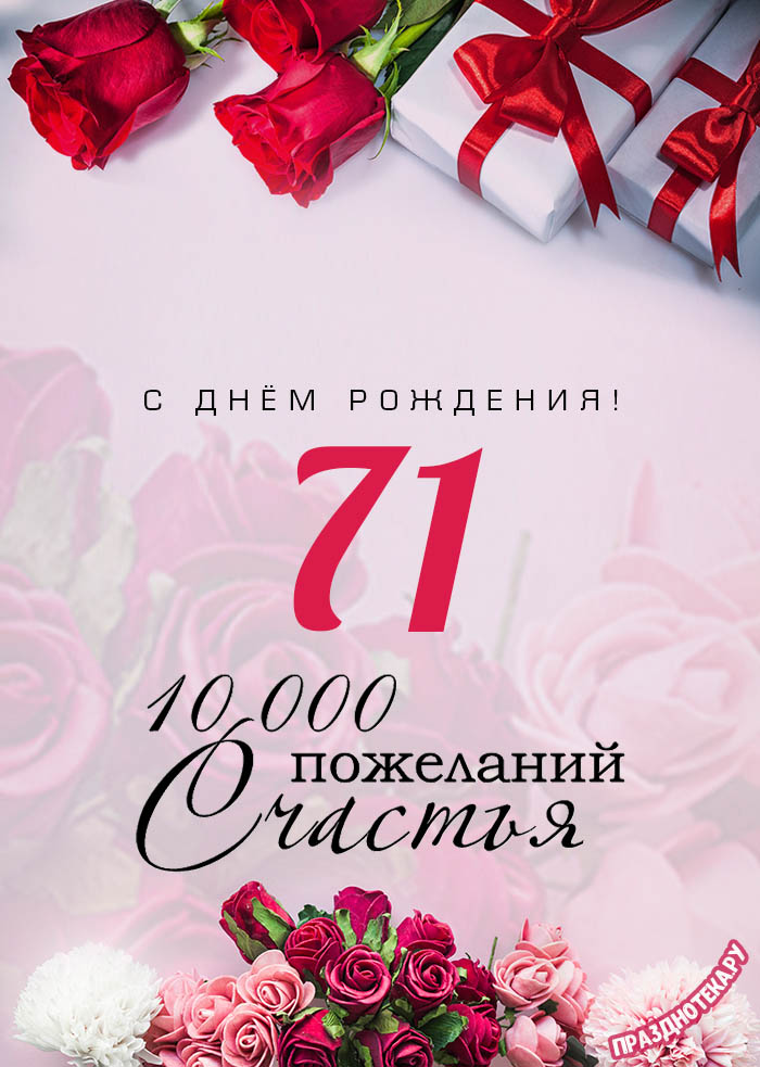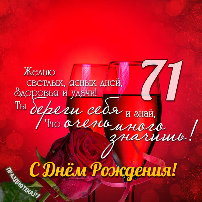 и купалоИх излучайте Вы Пусть греет сердце Не знать уныния И никогда неприятных трудность!Семьдесят первый свой родниИ душевного покоя.В жизни только был чтоб вид.Небо пусть Вас И пусть поможет И далеко ненастья!Любовь и счастье, и годы озорные.Вам не знать,