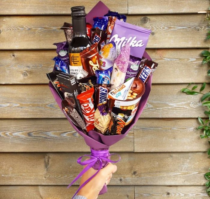 • В заготовку вставляется • Съедобный букет.оливок, бастурма, черный шоколад, бутылочка коньяка.