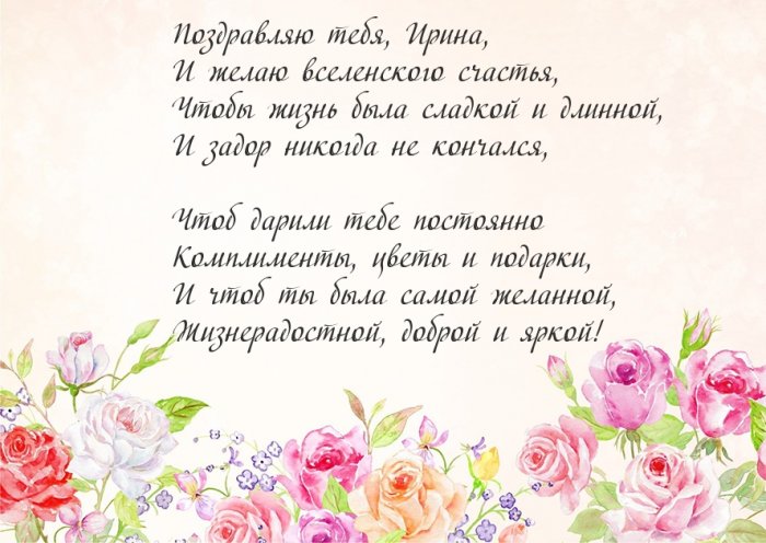 С днем рождения, Ирина! Ты не только красива, но и умна, талантлива и душевно богата. Желаю тебе не только сохранить все свои прекрасные качества, а также приумножить их.
