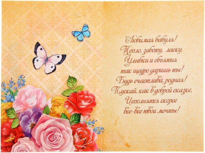 Душевности и мудрости,Здоровой и красивойгордости и счастьяВнучат веселых хоровод.Желаю крепкого здоровьяТвоя семья — вот твой успех!Не наживала барахла,первый взгляд проста,Ты мне, бабушка, навекОт родителей «прикроешь».