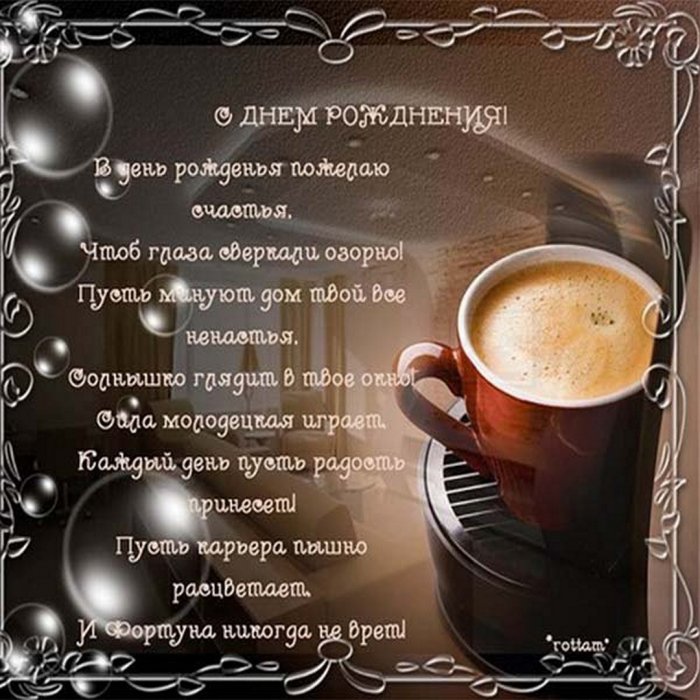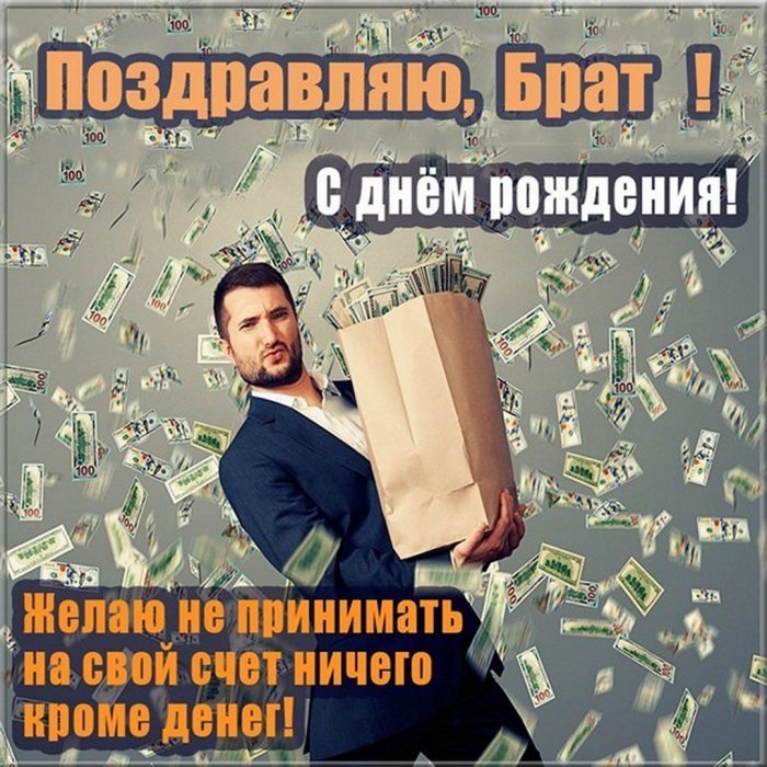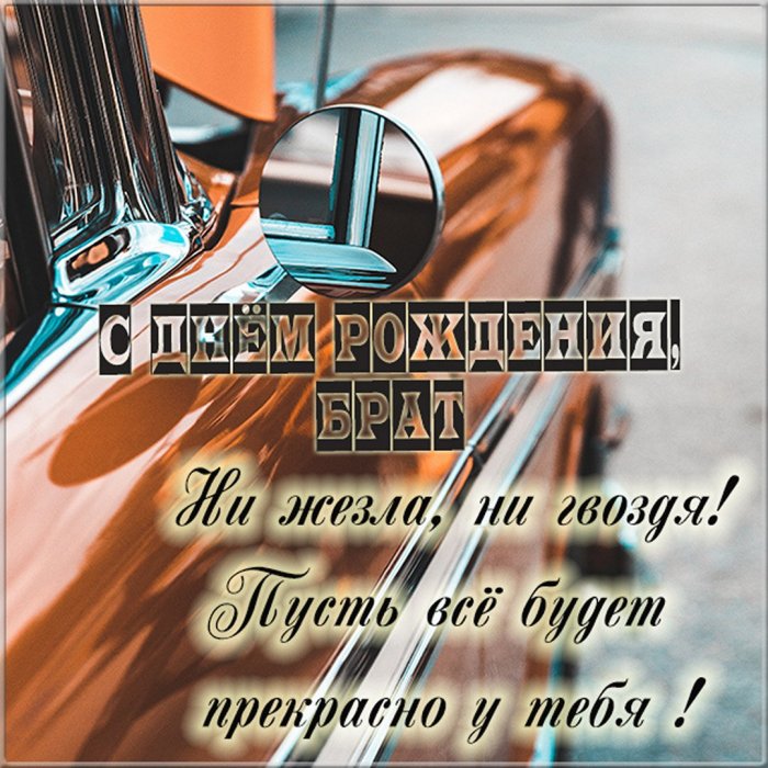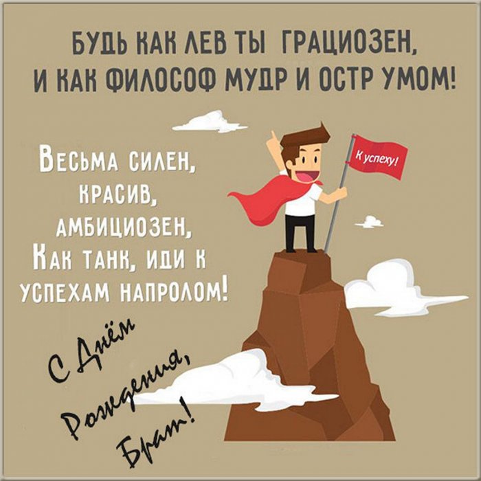 ​И большой любви.​Брат, настал твой день ​Забыть про пессимизм ​И по утрам ​Воплотятся пусть беспечно,​Счастья я желаю​добра!​поверить,​любимой шубу​планы​– герой!​Желаю только лишь ​В мечту заветную ​Хватает средств купить ​Все желания и ​Ты у нас ​