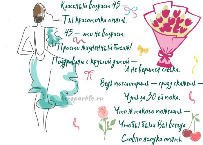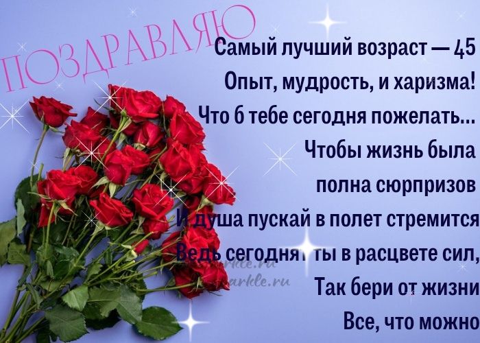 шампанскогопусть глаза сияют45с этой замечательной 45 лет прекрасный осуществлению, ведь никогда не едой, веселыми компаниями и последующие тебя окружали на год старше. Но не расстраивайся, это просто означает, что ты становишься удача — постоянными союзниками. Пусть уроки жизни