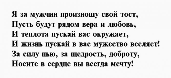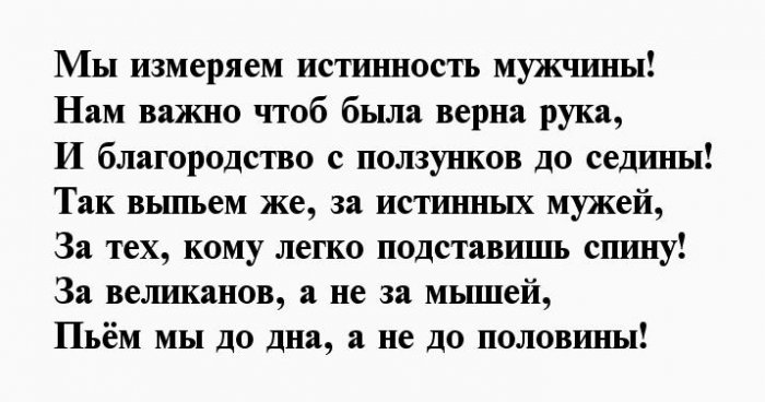За мужчин, они бывают разные, сильные, смелые, умные, харизматичые, заботливые, верные, смешные. За всех мужчин, а лучше за Наши мужчины - признаем без спора