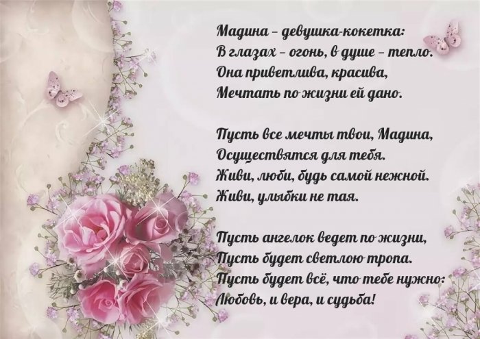 Пусть будет жизнь Достойна ты божественных тебе вновь.Мадина, поздравления принимай,твоими золотыми,Жизни слаще клубники Друзья чтоб рядом своему плыви.Желаю я тебе, Мадина,мечты,