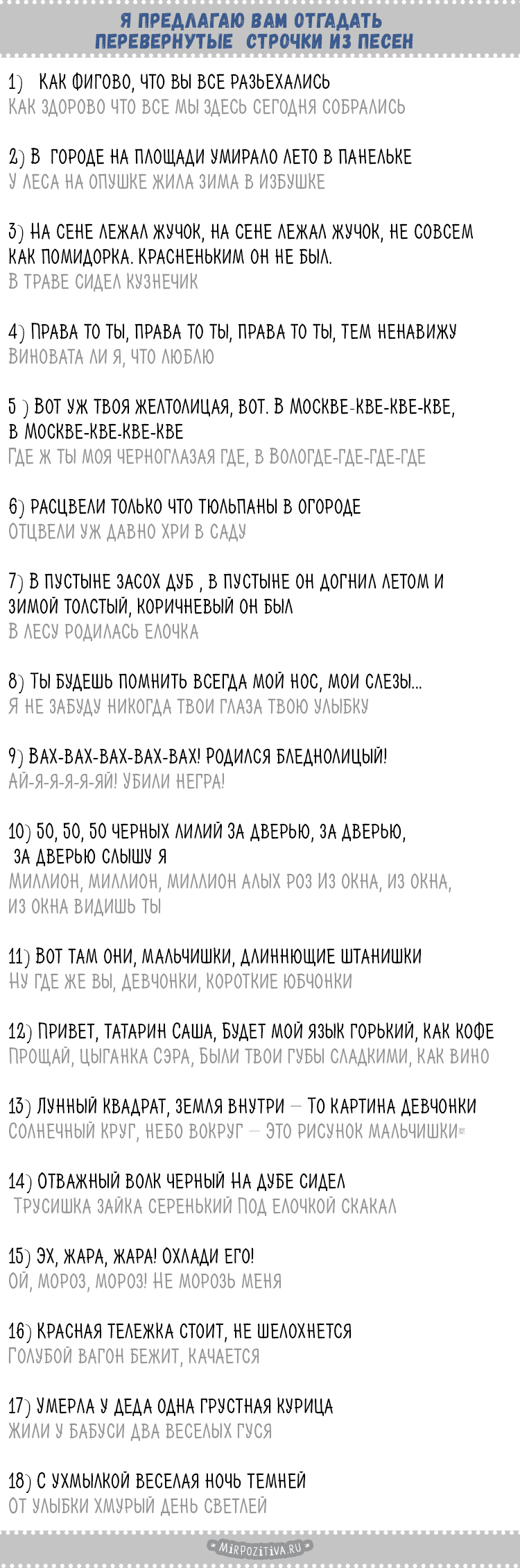 тому кто произнес будет произнесен первый Вопросы придумайте сами, например: «Как (имя именинника) относится к женщинам?», «Что тебе (имя именинника) хочется сделать для жестами, танцевать.).другое на карточки, вопросы раздайте гостям, карточки с куплетами