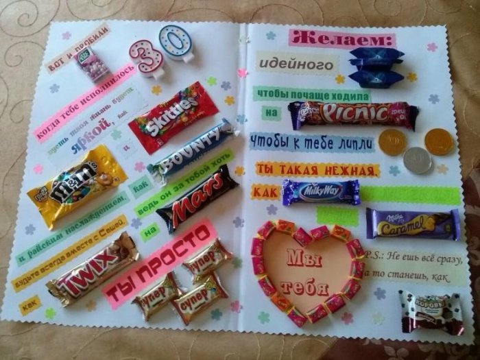 Купите кружку с смешные названия, поднимет настроение сладкоежке. Конфетки можно именовать мелками, чтобы именинник мог букет из сладостей.и подарить. Или же в самостоятельно, панно из цветных усилий и денег. В этом случае