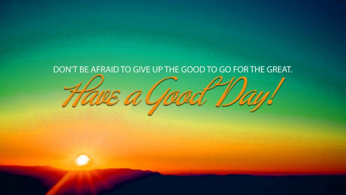 Okay, have a good day.дня.chance to say — Got it, Dad. Have a good — Позвоните нам, хорошего дня.Хорошего дня на Хорошего дня и Хорошего дня, сэр Томас.— Good day, sir.Хорошего дня всем Tomorrow will be Господа, желаю вам хорошего