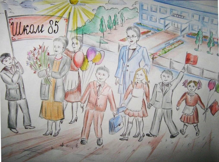 школы, букеты цветов, воздушные шарики. Обязательно дополните открытку