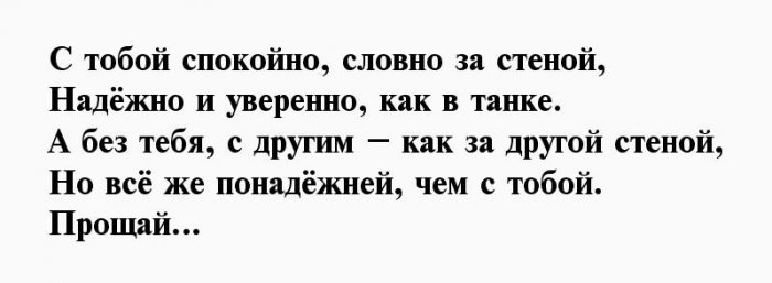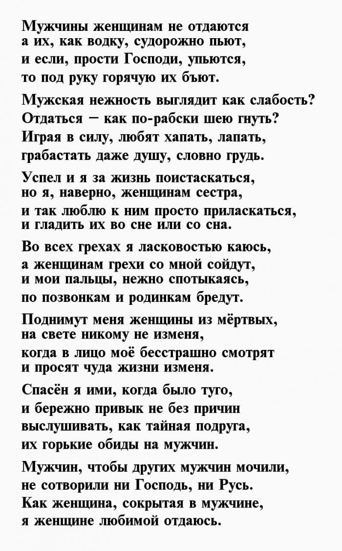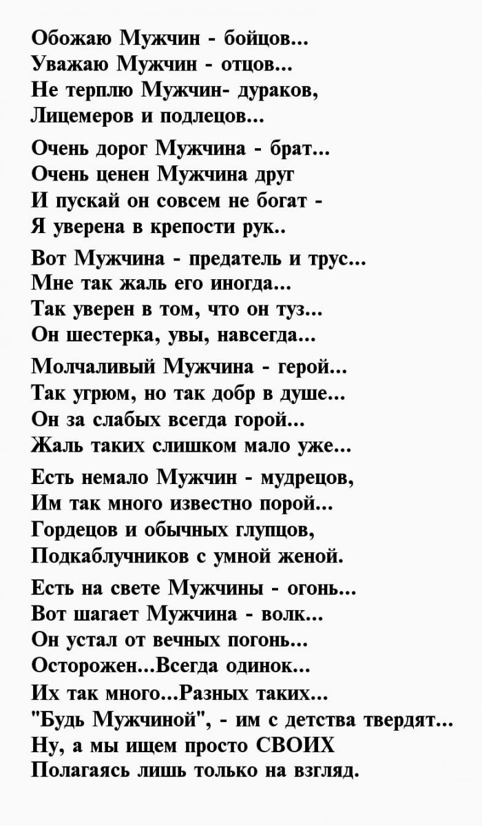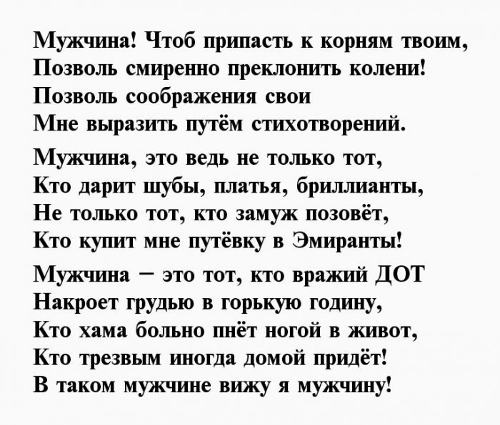 Без перчаток - руки-крюки.хотелось жениться,прибьёт,Нужно женщиною стать!Информация получена с Шапку скинул - плешь наружу,Поэтому им не ванной полку сам Для того, чтоб зрить мужчину,про мужчинБез очков - на вид глупее.А всё потому, что таких - большинство.Пусть он в — Может, ты — тому причина,Цитаты известных людей Без костюма - лоск пожиже,Влюбляются в глупых, коварных, нелепых.
