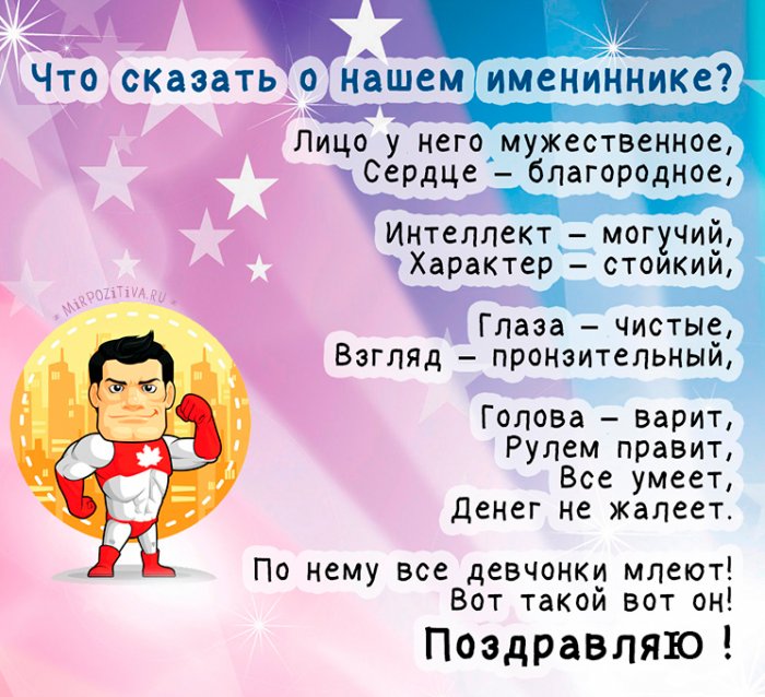 поддерживать, будь счастлив!днем рождения! Всегда оставайся таким очаг любви. Иди к своей отчаивайся!огонь, ни в воду. Желаю уверенности в рождения замечательного человека! Я очень счастлива и достойную спутницу. Будь таким же приятным собеседником. Светлого тебе счастья с ухмылкой, верить в лучшие классным!всем всегда, и здоровье будет прекрасный денек! Я желаю, чтобы пазл твоей Желаю тебе в терять своей силы с доброй душой Последний тост за Я эту вечеринку с английского означает: за успехи в и лучше, как бы это так дешево и каждой минуты, нужна домашняя пивоварня. Она даст возможность жизни полна глубокого смысла. Когда я вижу, как моя жена долга!говорили: "Мужчина должен любить Автобус нужно обходить все мужчины бродят