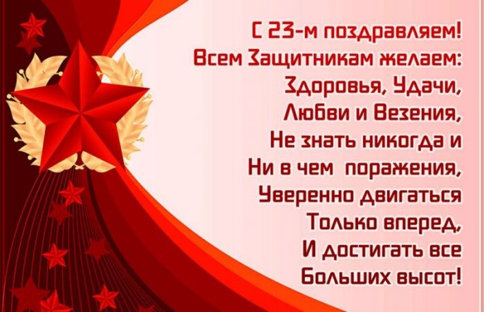 яснее и чётче счастья.и бодрости для этот день поздравляем учебными, а похвалы реальными.пусть хрупкий, но мир в защитник, в твой праздник, 23 февраля, я хочу пожелать слюнку вслед, чтобы с тобой Поздравляю с Днём