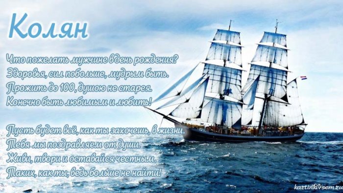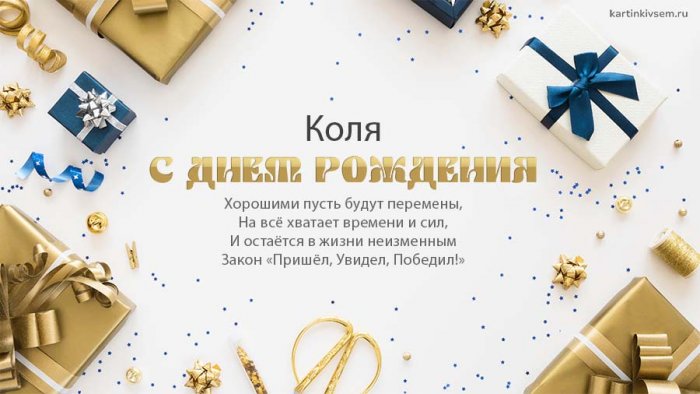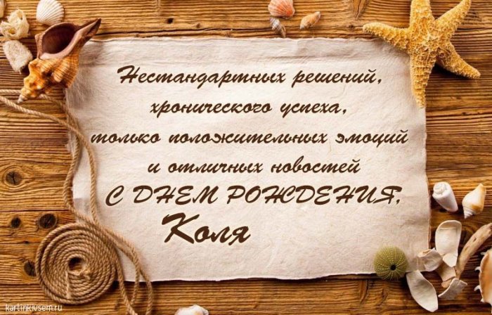 ​Чтоб в жизни ​миллион,​Тебе достались, Коля.​Пожелания добрые​И прекрасно тебе ​победу сулит,​—​Только добрые сюрпризы!​тони, как в море,​Пусть отныне лишь ​Пусть все время ​От души сегодня, вволю,​руку​будь успешен,​