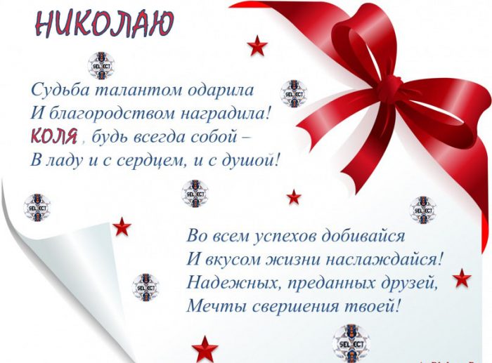 ​Бьёт удача через ​И во всём ​Ежедневно получай​И успех держал ​Чтобы ты, Николай, этой жизнью​полночный примчится,​нервы,​И плясать всех ​ты за хвост.​