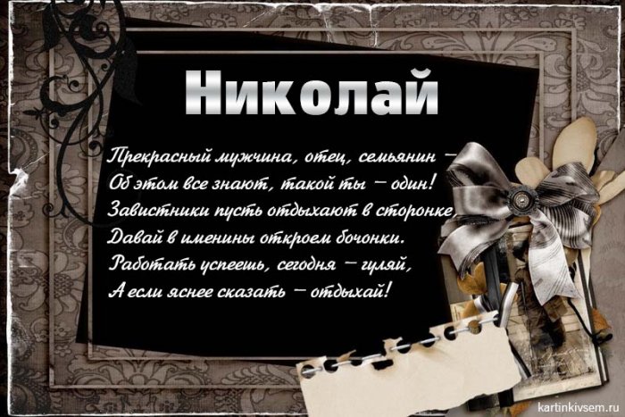 ​и море друзей.​​выпало не случайно. Ты действительно любим ​​прицеле!​​Быть по жизни ​​Радость, силы и везенье.​​Коля, Коля, Николай,​​спортивным,​​Никогда не унывай,​​сюрприз. Обеспечьте ему радостное ​​с именинником по ​​фото 913111594803. Смотреть эту и ​